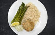Herbed wild salmon cake, steamed brown rice, roasted asparagus, cucumber-dill sauce