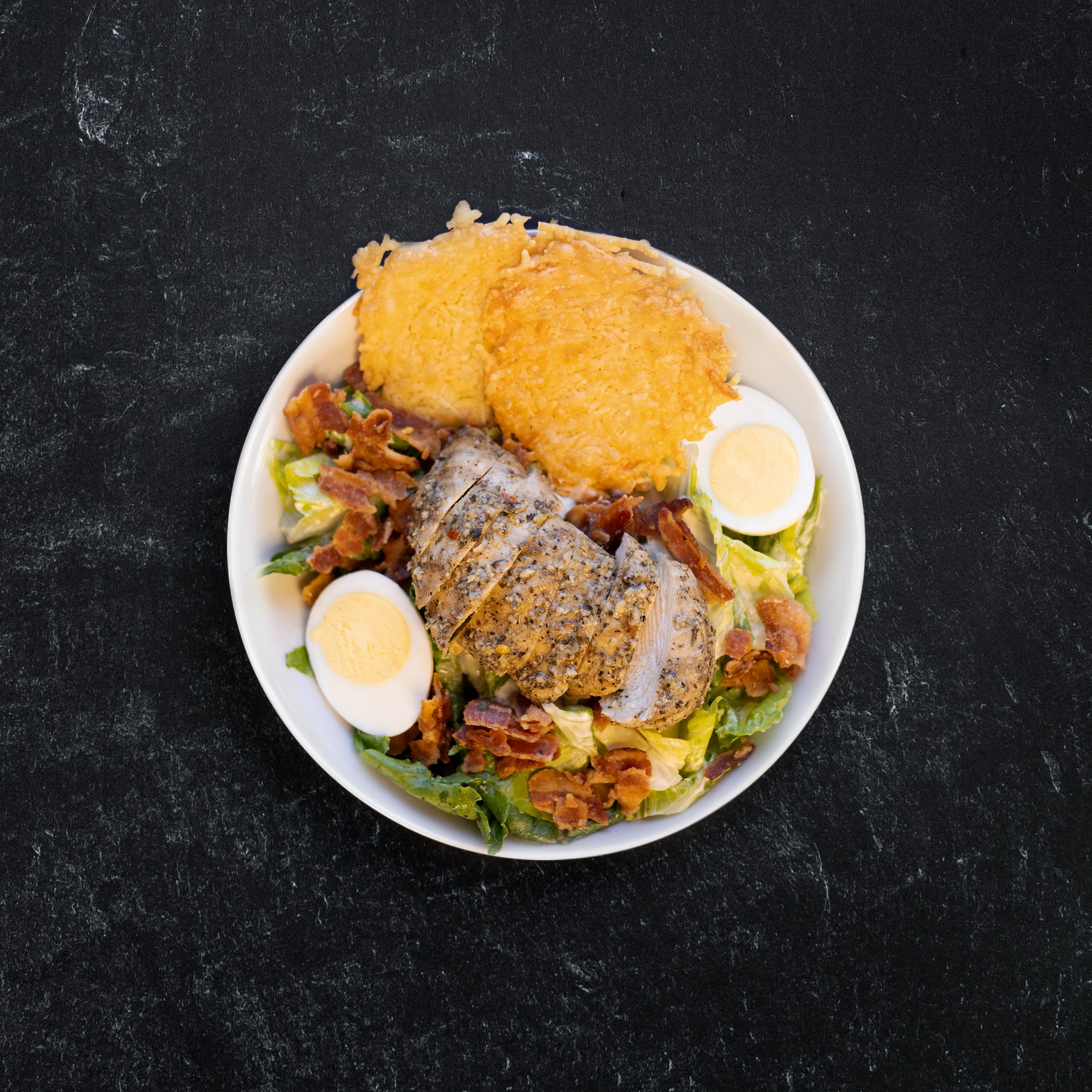Free-range chicken, olive oil Caesar, parmesan crisps, bacon, hard-boiled egg