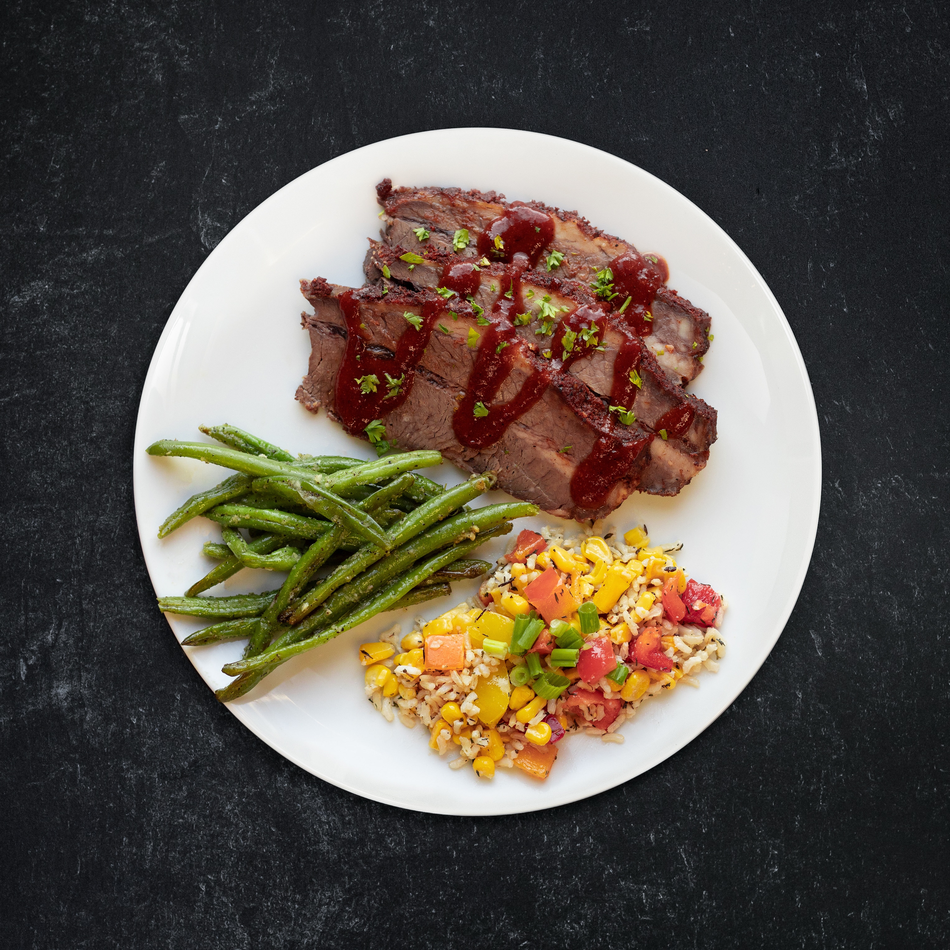 Beef brisket | roasted corn & poblano brown rice | blistered green beans | honey-chipotle sauce