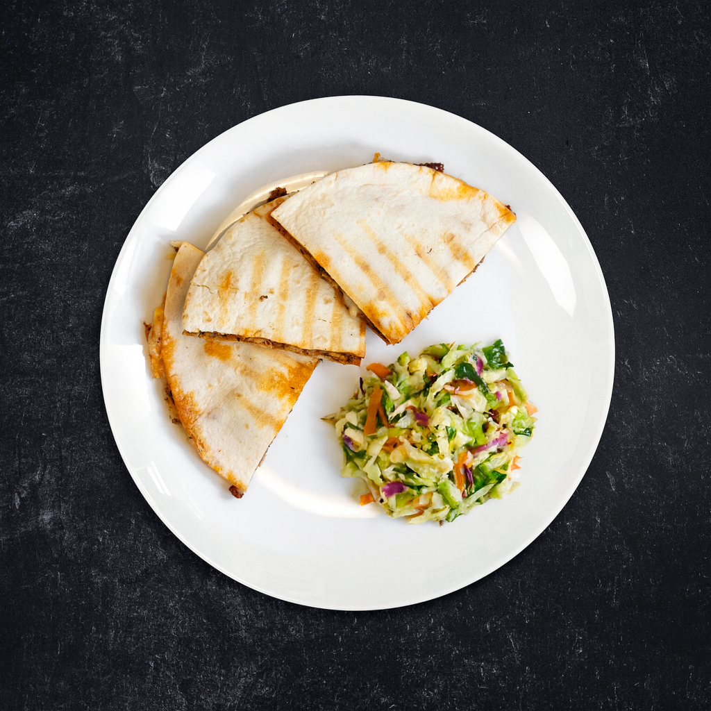 Grass-fed beef, smoked gouda, caramelized peppers & onions, low-carb tortilla, chipotle lime slaw