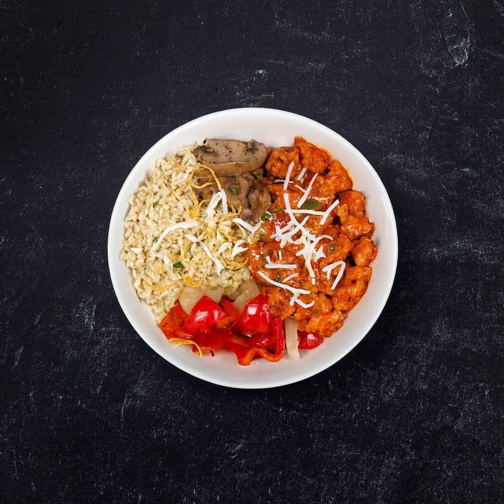 Ingredients: Antibiotic & Hormone-Free Chicken Breast, Riced Cauliflower, Mushrooms, Bell Peppers, Onions, Cheese Sauce (Milk) (milk, gruyère cheese, cheddar cheese, cooper cheese, organic grass-fed butter, potato starch, white pepper, black pepper, garlic powder, onion powder, sea salt), Honey Buffalo Sauce (Louisiana Hot Sauce, Organic Grass-Fed Butter, Wildflower Honey, Garlic), Tamari (Soy), Olive Oil